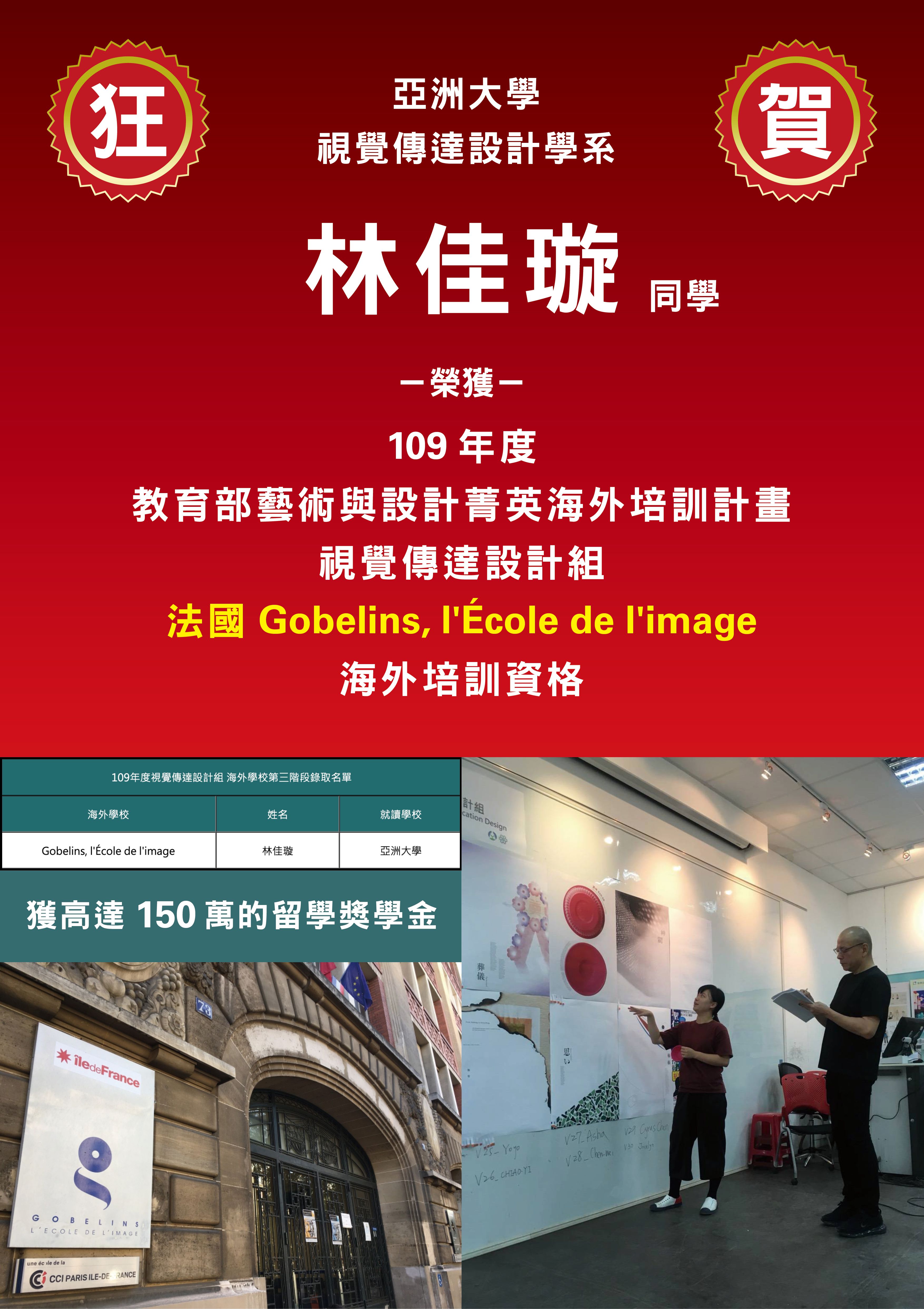亞洲大學(Asia University, Taiwan)視覺傳達設計系林佳璇同學,參加2020年教育部「藝術與設計菁英海外培訓計畫」視覺傳達設計組,決選時擊敗眾多高手,脫穎而出,錄取到法國Gobelins, l'École de l'image留學深造一年,教育部將提供150萬元培訓獎學金。