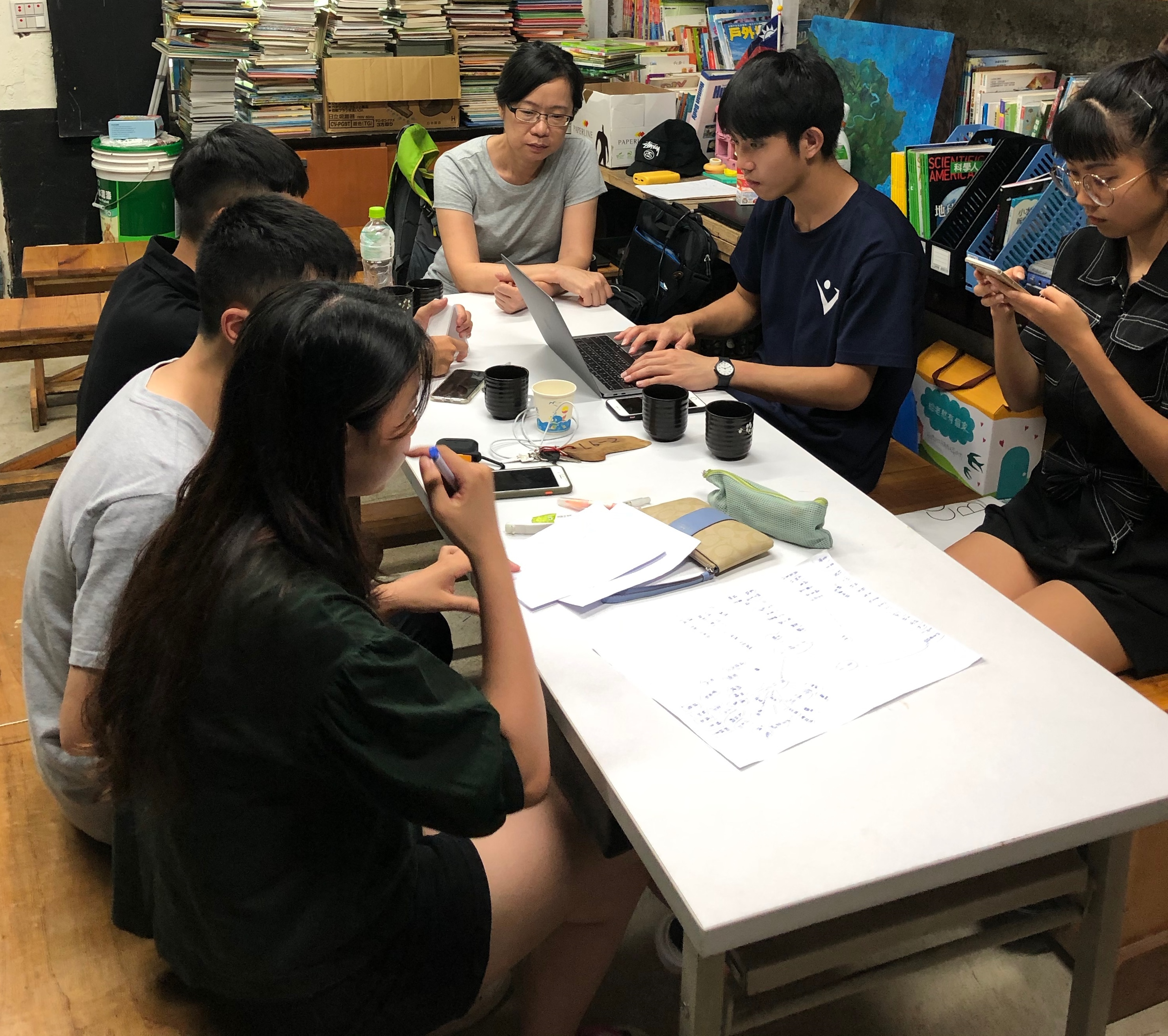圖說:指導老師侯曉蓓實地訪視與視傳系大二學生組成的「火金菇」團隊成員,在螢火蟲書屋裡討論。 |