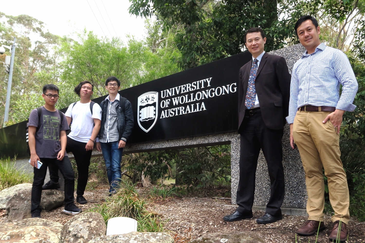 圖說:商設系主任龍希文(右二)偕同3位商設系實習學生,與澳洲伍倫貢大學老師Dr. Winson Lee(右一) 在伍倫貢大學校門前合影。 |