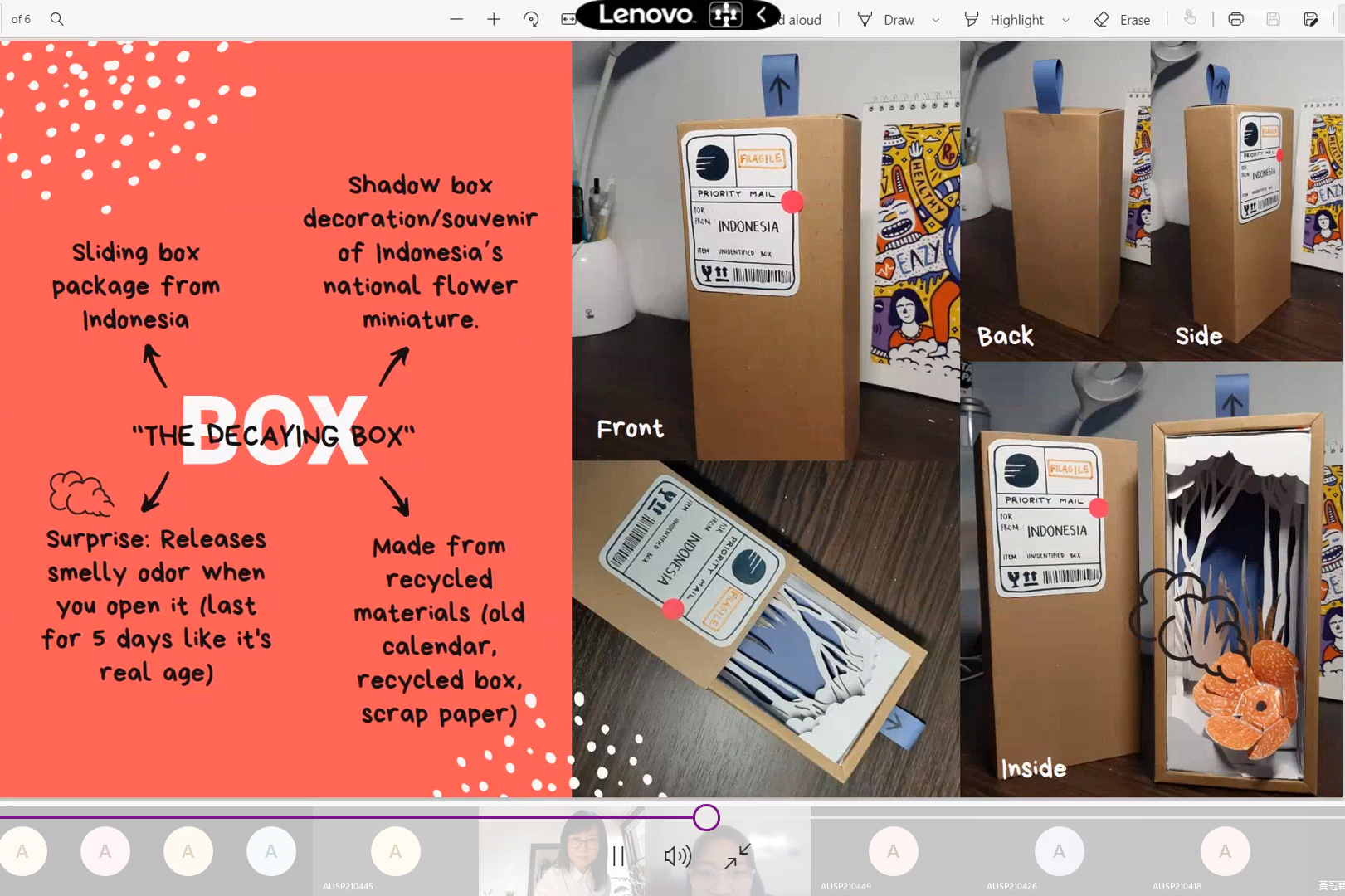 兩周的「創意文化產業」教學單元,首先由商設系老師龍希文的「基礎實作」打頭陣,因學生背景並非全數來自設計相關學系,從實作中可理解基礎產品設計概念與歷程;接下來課程由外聘專家盧彥文設計師帶領學習創意空間規劃;屏科大老師謝維合帶領學生認識時尚設計史,以及時尚產業在疫情下如何將秀場與行銷數位化;數媒系老師林峰正帶領學生欣賞台灣新動畫,指導小組創作動畫角色與分鏡表;視傳系老師黃茂嘉指引小組設計思考;時尚系老師黃明媛解說亞大所在地霧峰重要的文史變遷、實際原型手作與結業發表會。 來自印尼泗水理工大學(ITS)視傳系I Nyoman Tri Sendyana同學,總結兩周課程所學,發表「峇里島Barong神獸」紀念品,以Barong形似台灣舞獅咬緊寶物的大嘴巴,做為紙盒構造,裡面放置象徵印度教三位神祇保佑的Tri datu黑白紅三色線手環,完整地將文化故事元素融入商業設計。同校土木工程學系Shania Diandra Mahardika同學,以蘇門答臘大王花「Padma Raksasa」為主題,設計出具有景深效果的禮物盒,顯示它在印尼三種國花中相對特殊的趣味性,也帶來了歷史與植物學科普知識。